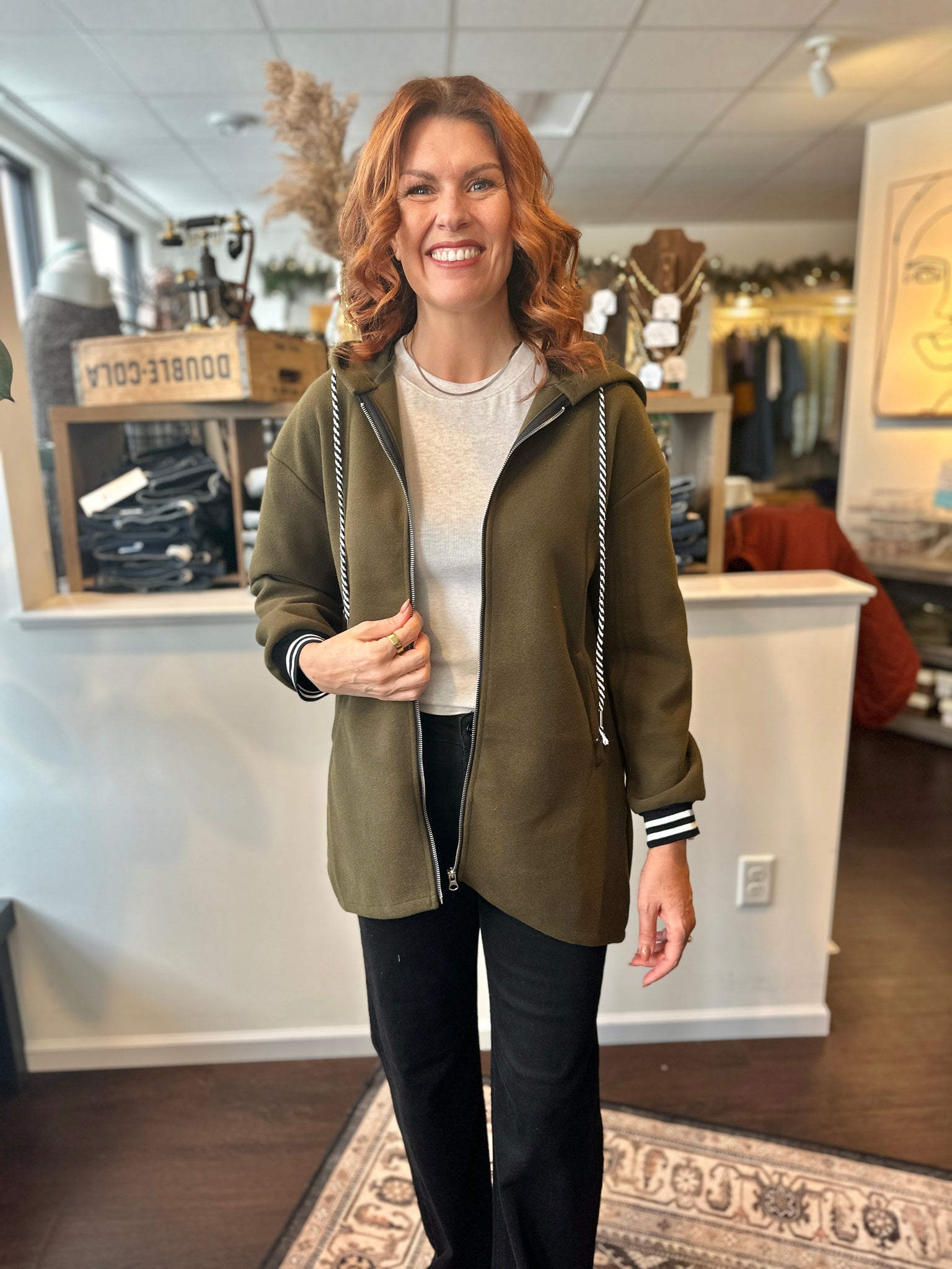 This is the kind of jacket you grab on your way out the door and somehow it makes the whole outfit feel intentional. The Cityline Jacket is a long zip-up style with an easy open fit, drop shoulders, and just the right amount of structure to polish up casual days. We love the sporty-chic black and white stripe detail at the cuffs, drawstrings, and back hem—it adds personality without trying too hard.