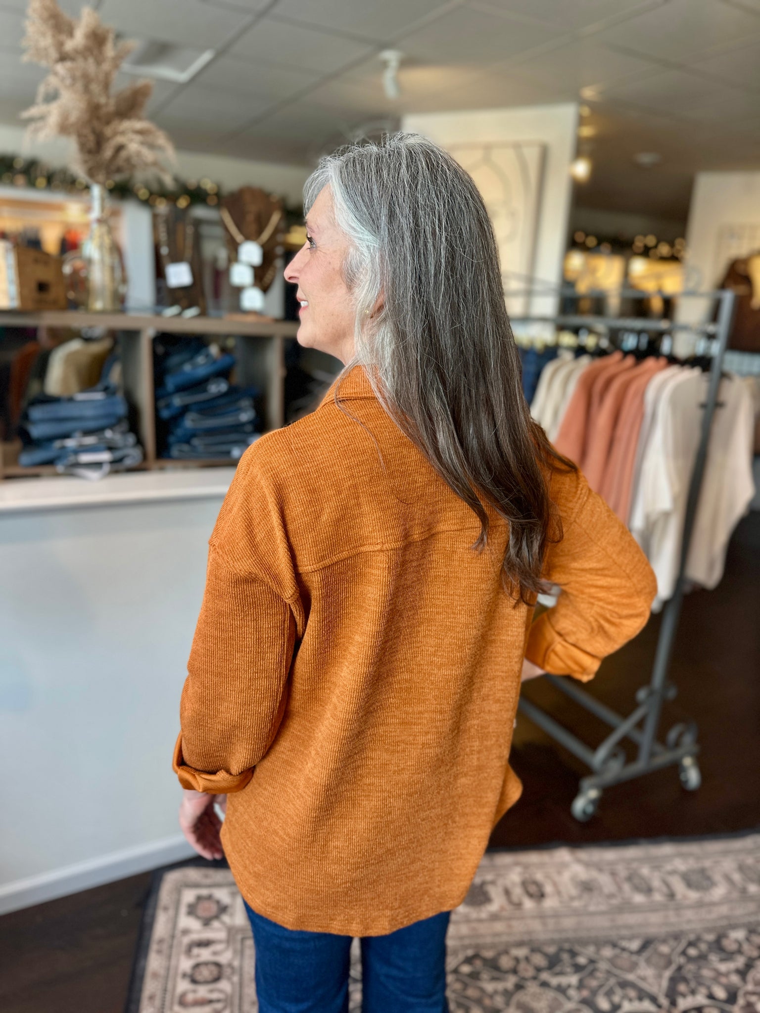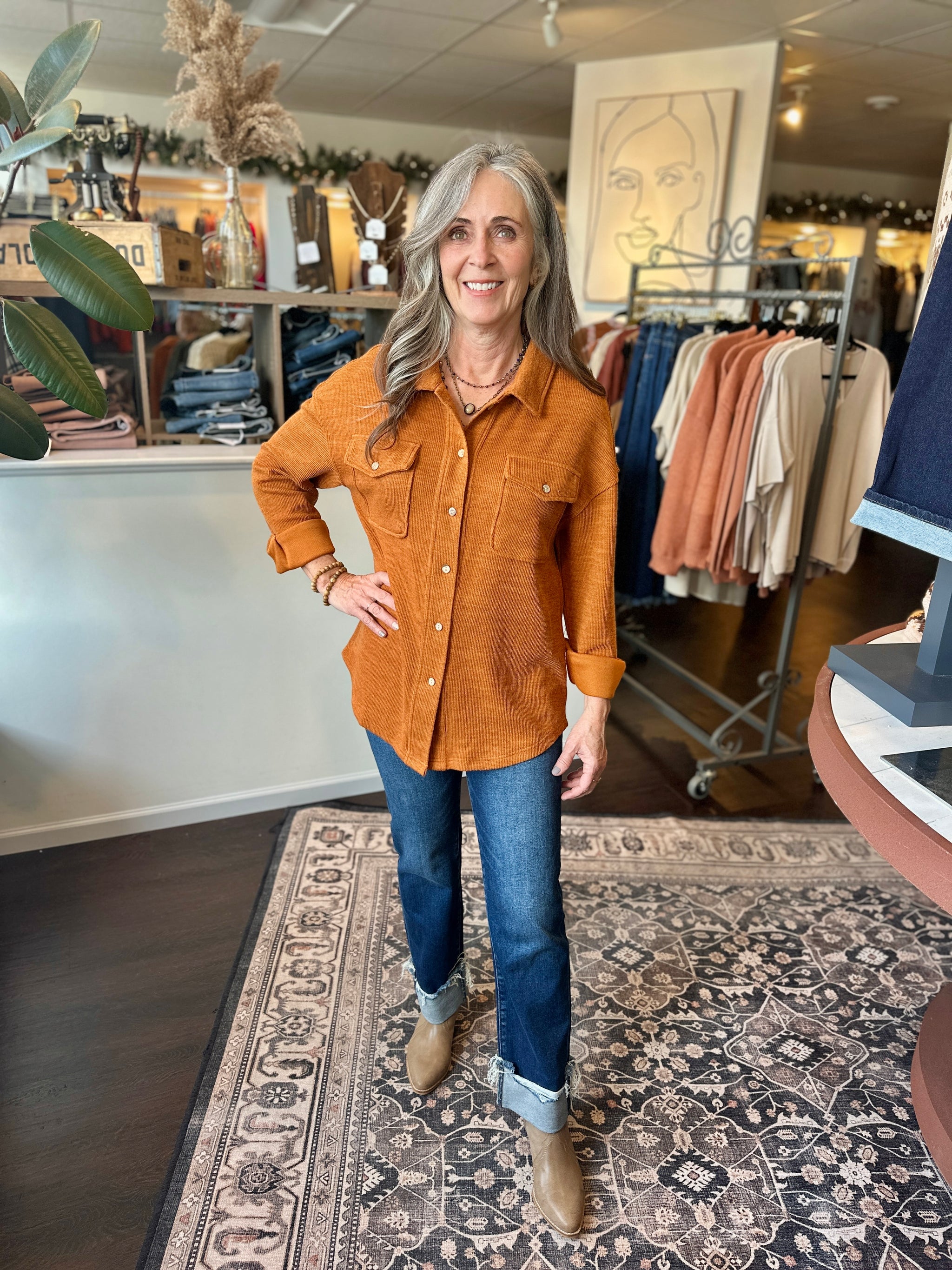 A soft, textured shacket in a rich, pumpkin-spice orange that feels instantly warm and cozy. It has an easy, relaxed fit with a subtle ribbed knit, making it softer and more flexible than a typical shacket. The double chest pockets and button front keep the look classic, while the longer length makes it great for layering. It’s one of those toss-on pieces that adds color without being loud — just an effortless fall staple.