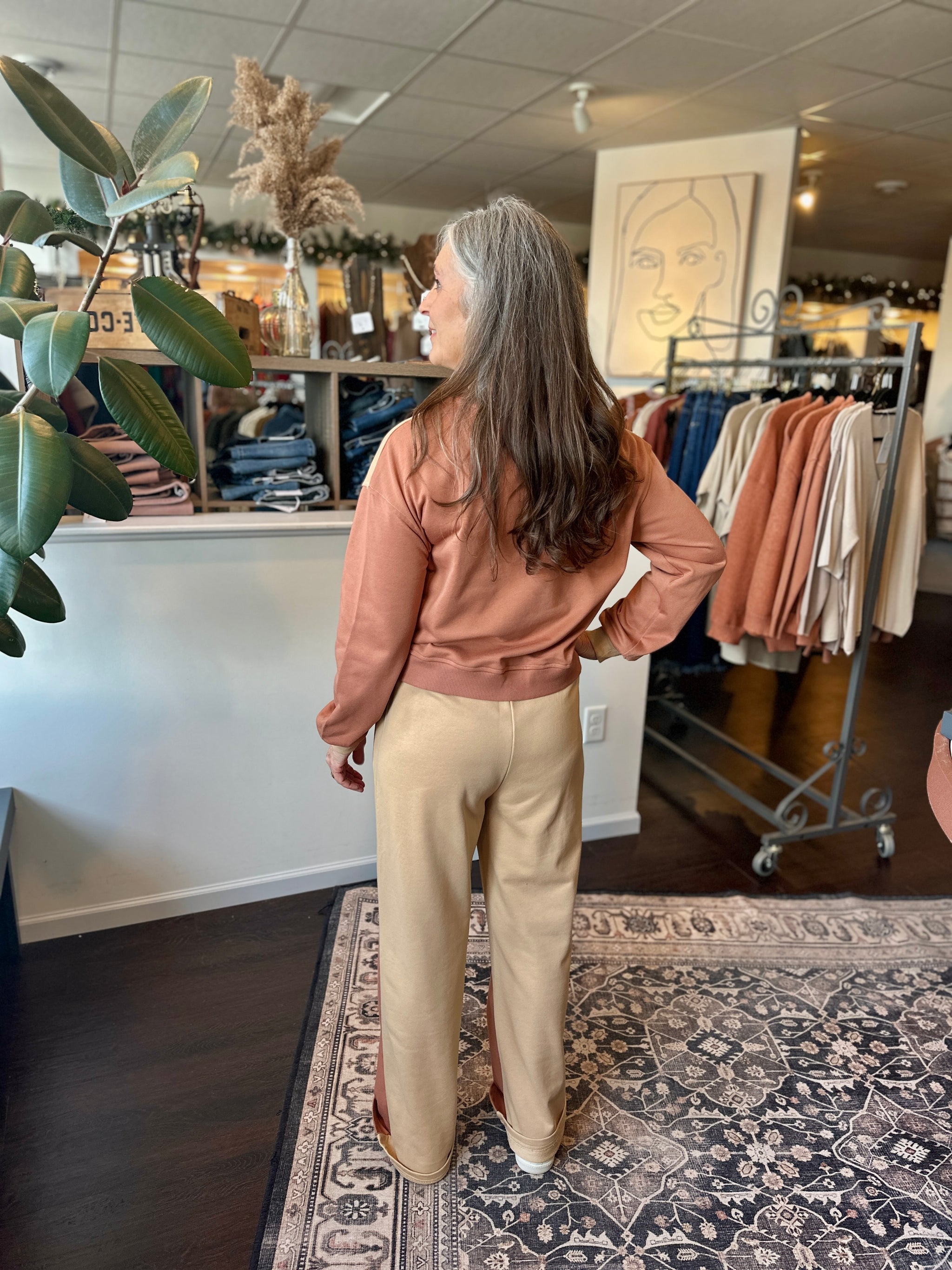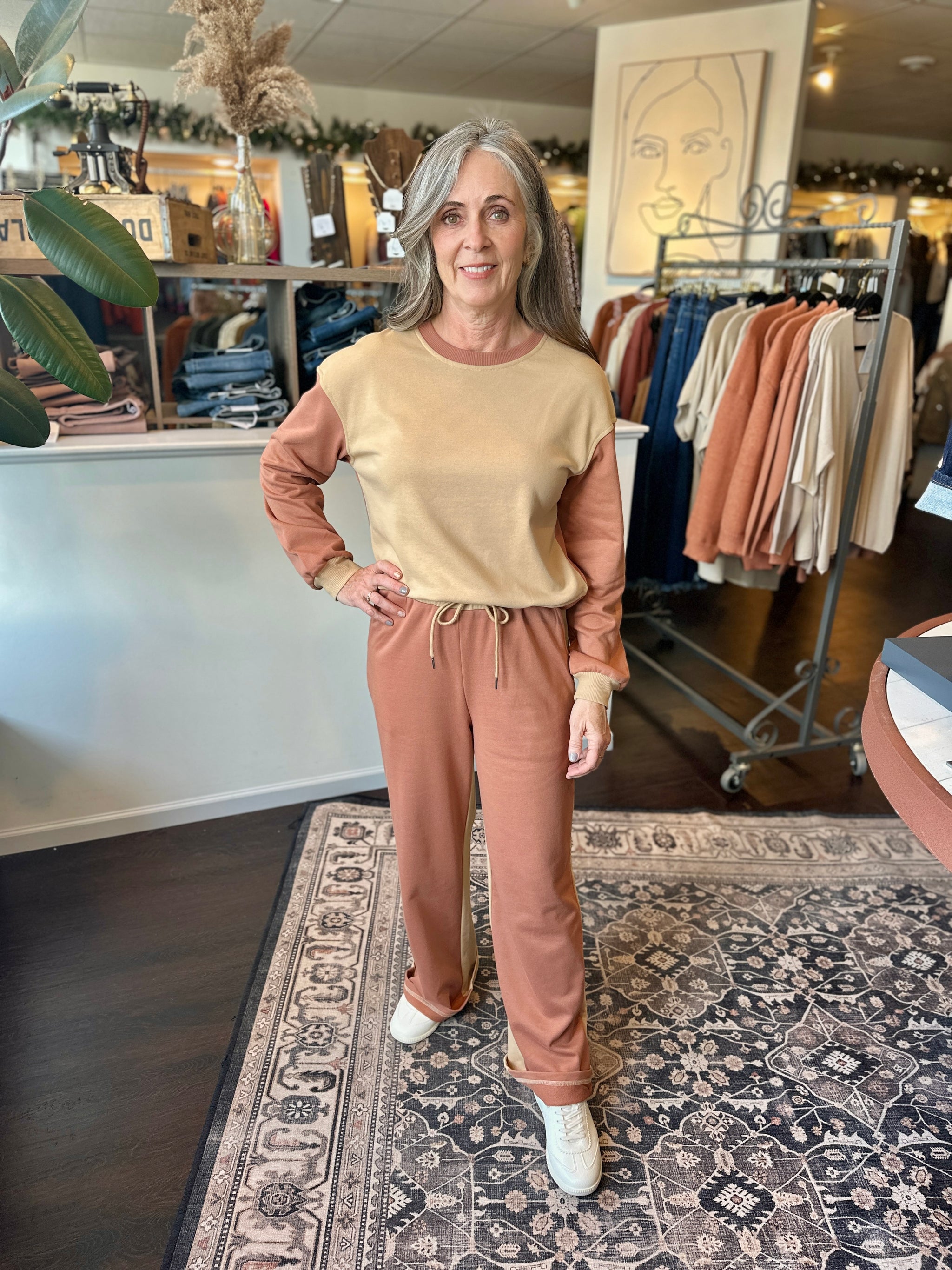The Sunrise Set is that cozy-but-put-together look we all secretly want to live in. The top has a soft, color-blocked blend of warm sand and muted clay—like the first hint of morning light. The pants flip the colors, which makes the whole outfit feel intentional without trying too hard.