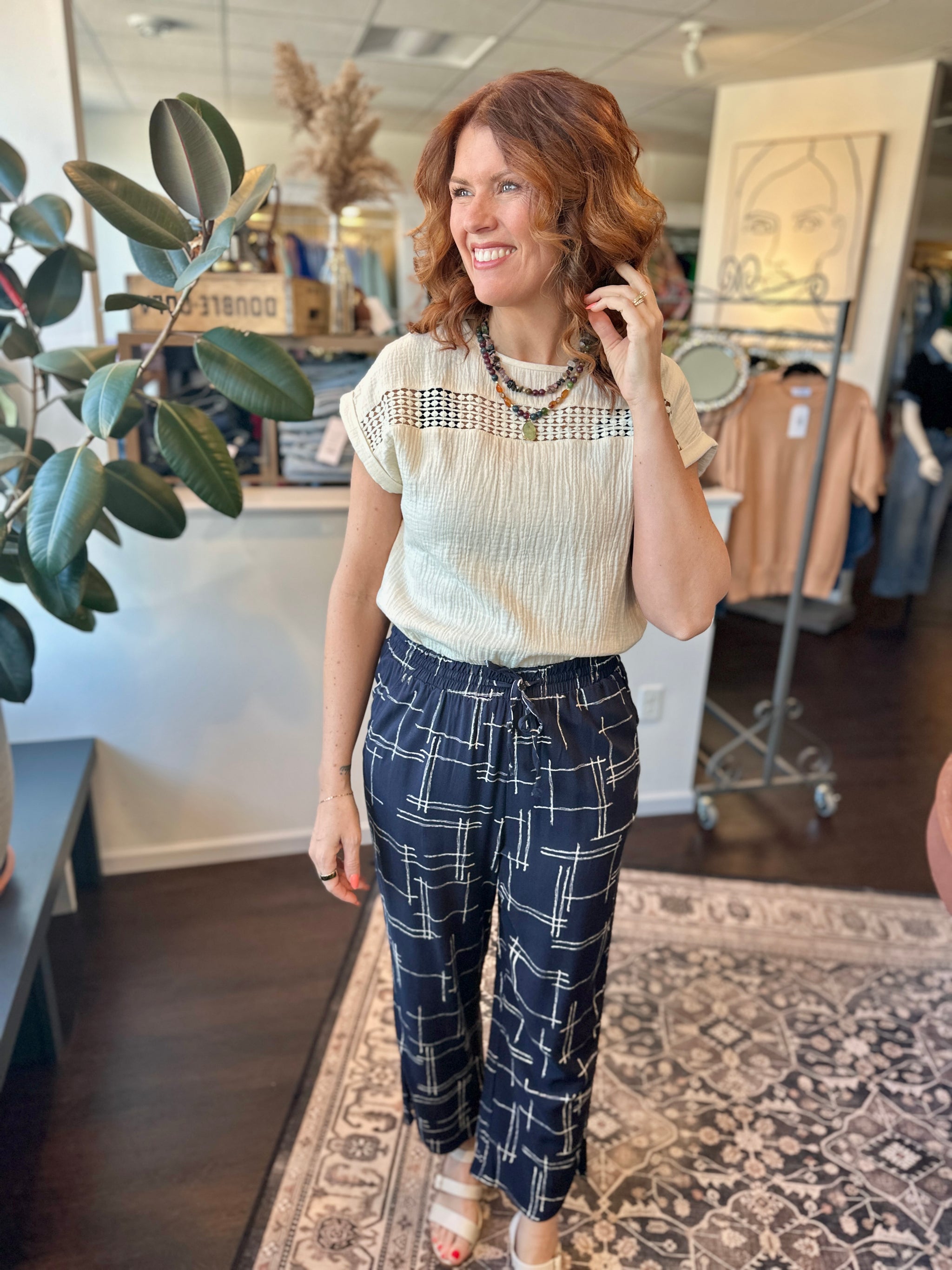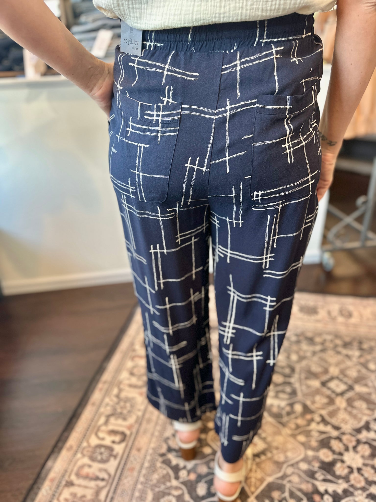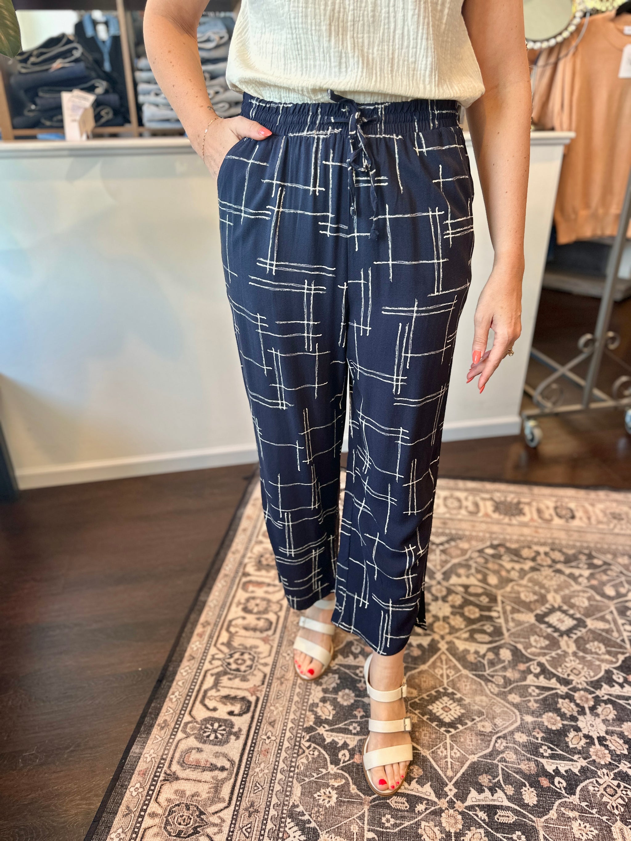 Easy, lightweight pants in a deep navy with a modern abstract line print. They feature a comfy elastic waistband with a drawstring, a relaxed straight leg, and an effortless drape—polished enough to dress up, comfortable enough for everyday.