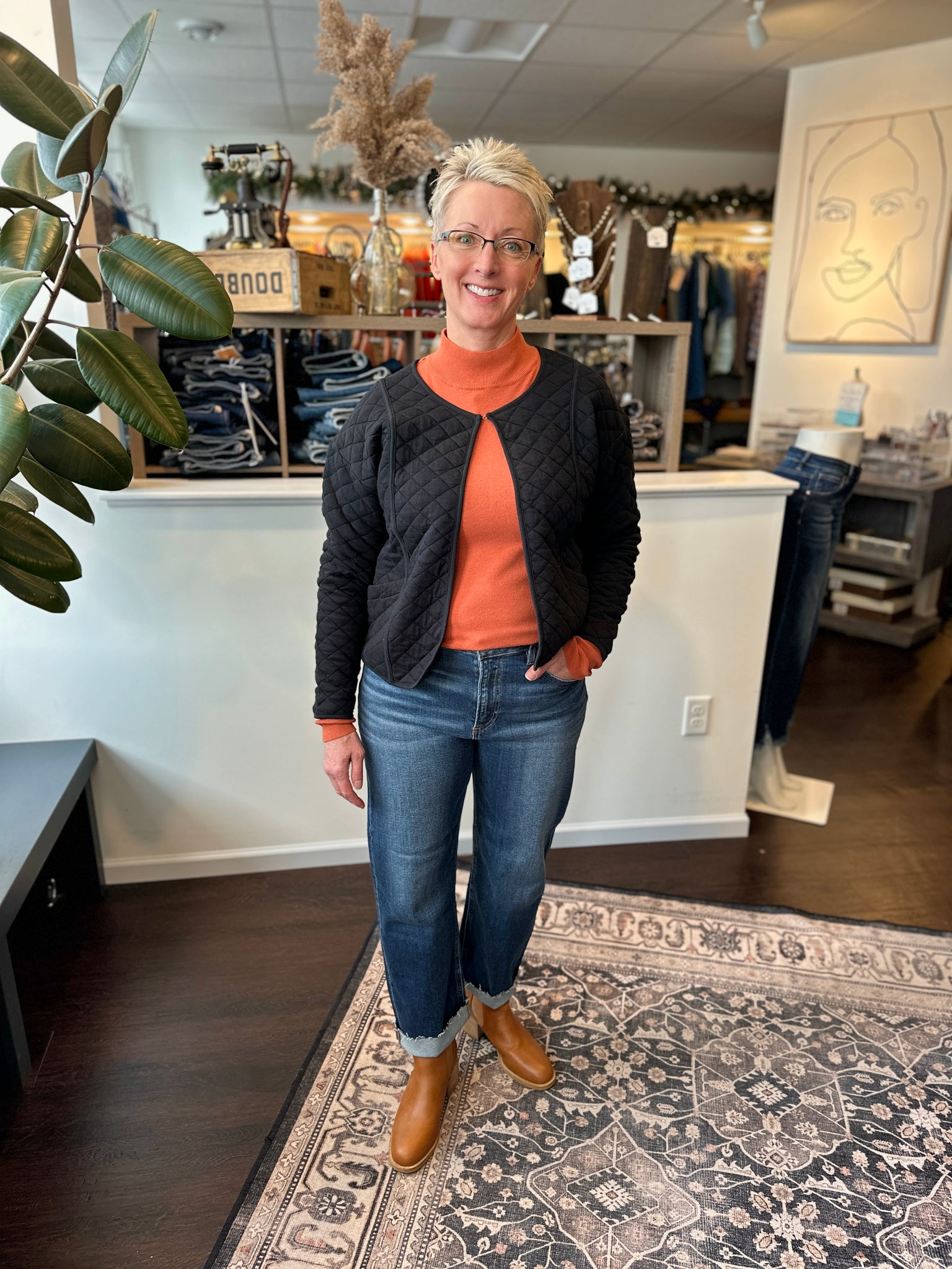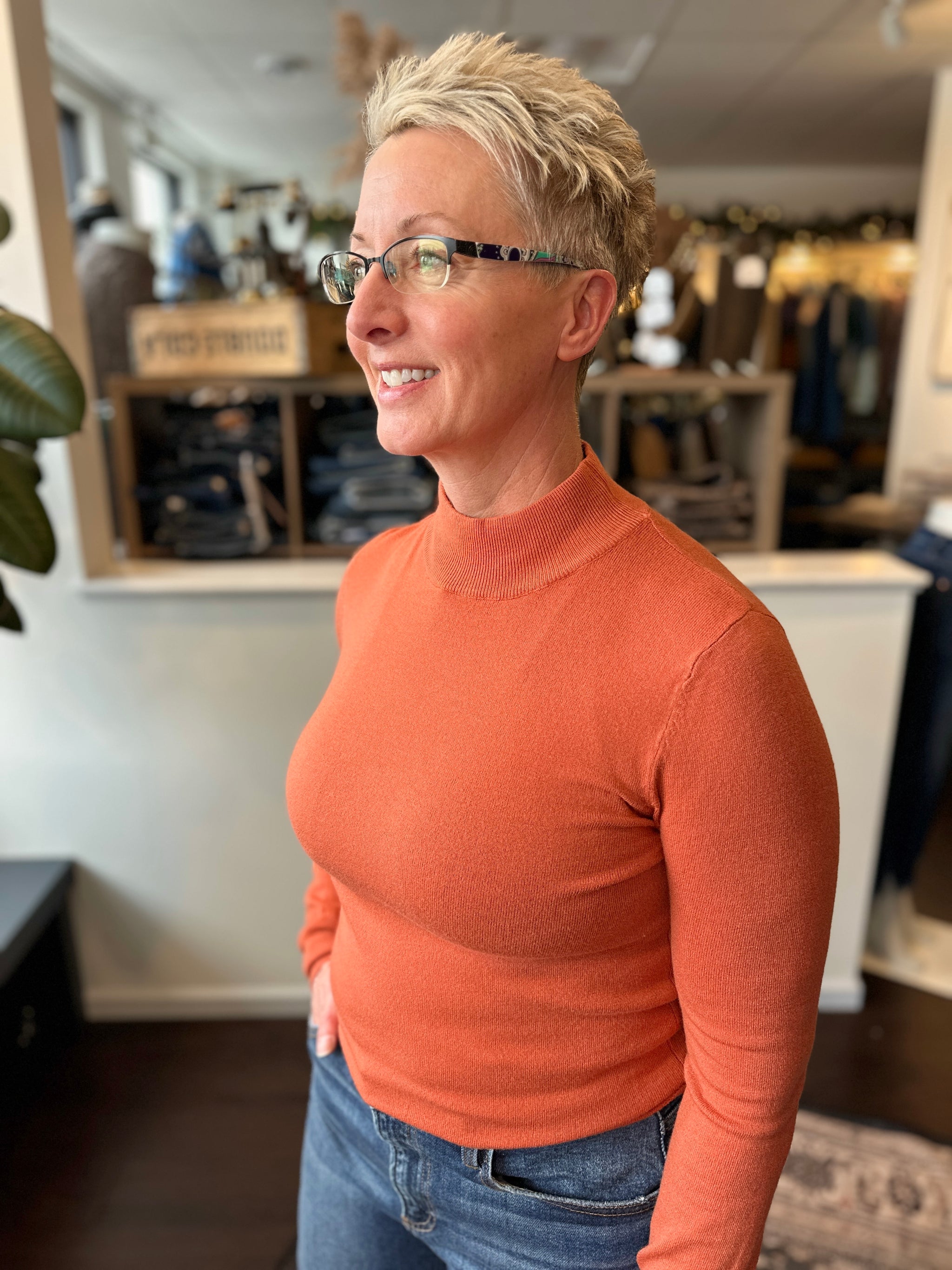A lightweight, fine-knit mock turtleneck that layers like a dream. Soft on the skin with a smooth, stretchy feel, it gives you that polished neckline without the bulk of a full traditional turtleneck. The fit is easy—not clingy—and works beautifully under jackets, cardigans, shackets, or vests. A true wardrobe staple you’ll reach for in every season.