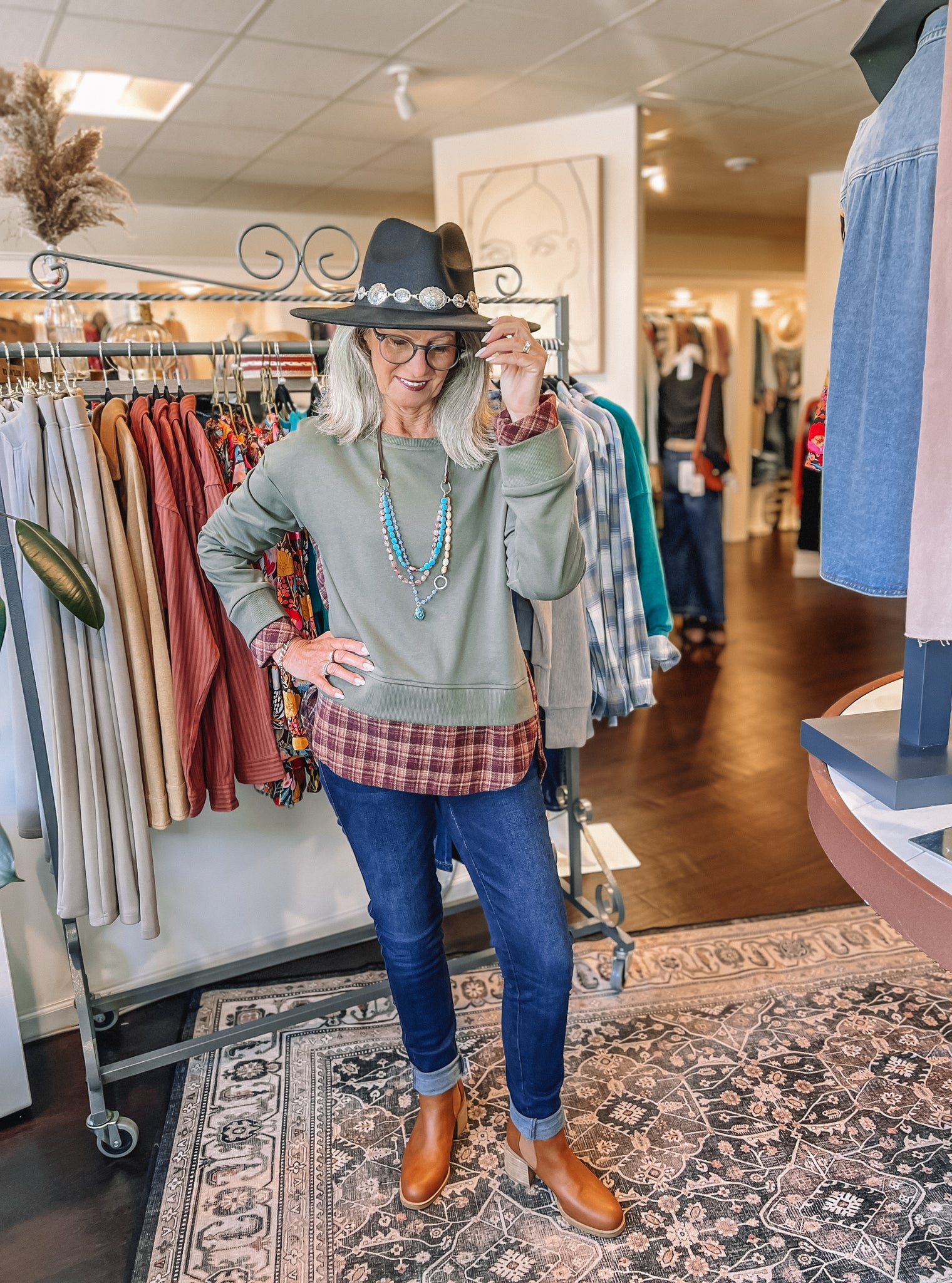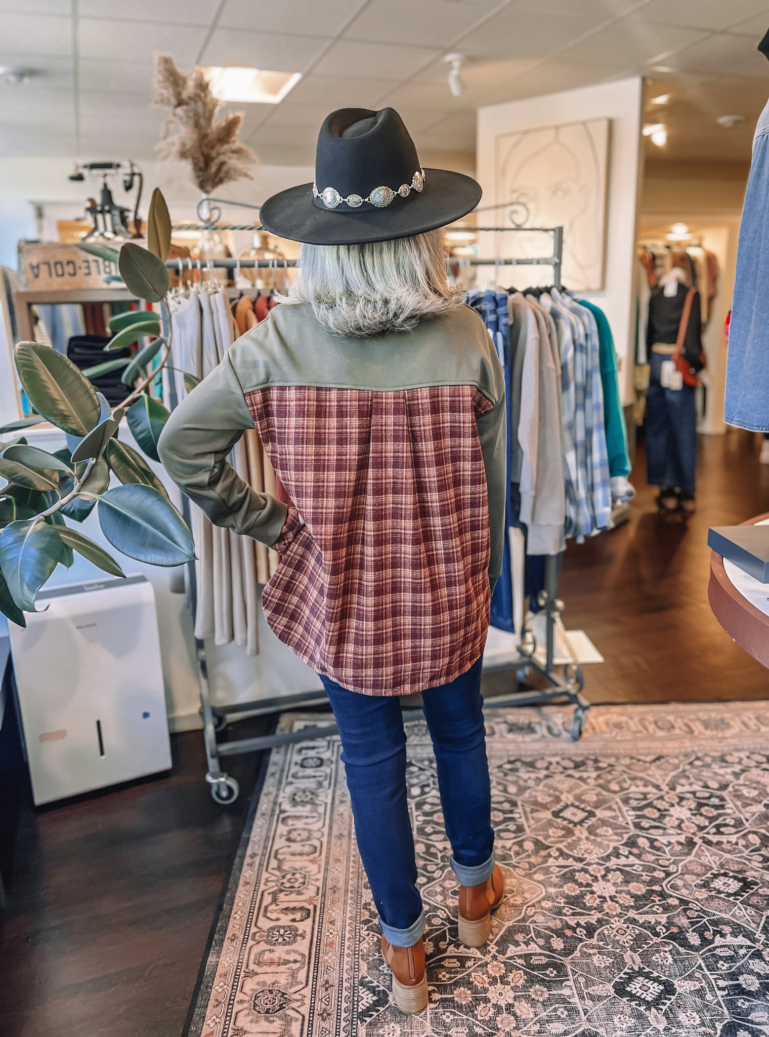 This sweatshirt brings the best of casual with a fun twist of detail! The olive knit front and sleeves keep it comfy, while the contrasting plaid hem and back give it that layered look—without the fuss. It’s the perfect "one-and-done" piece for effortless style that still feels special.
