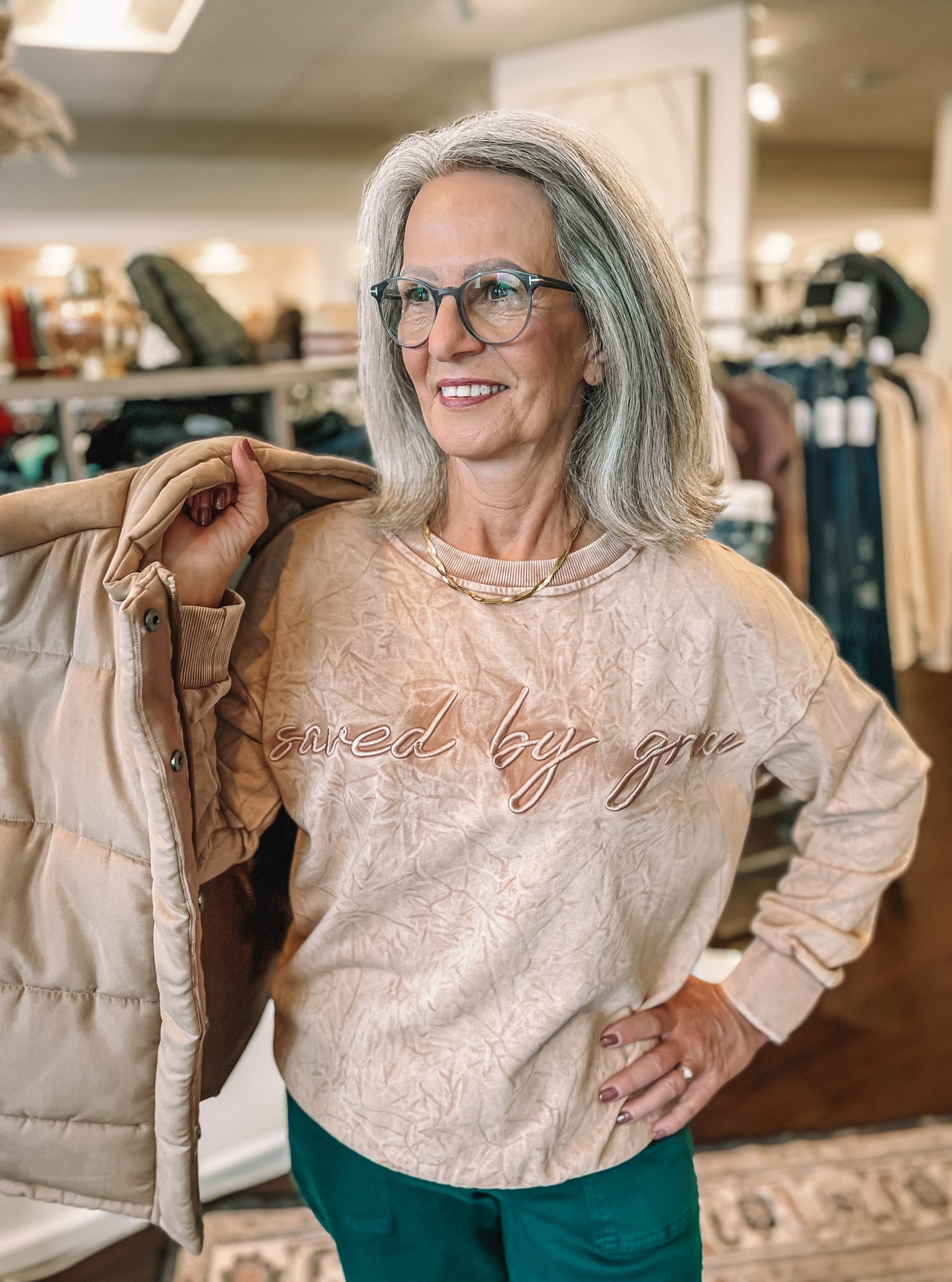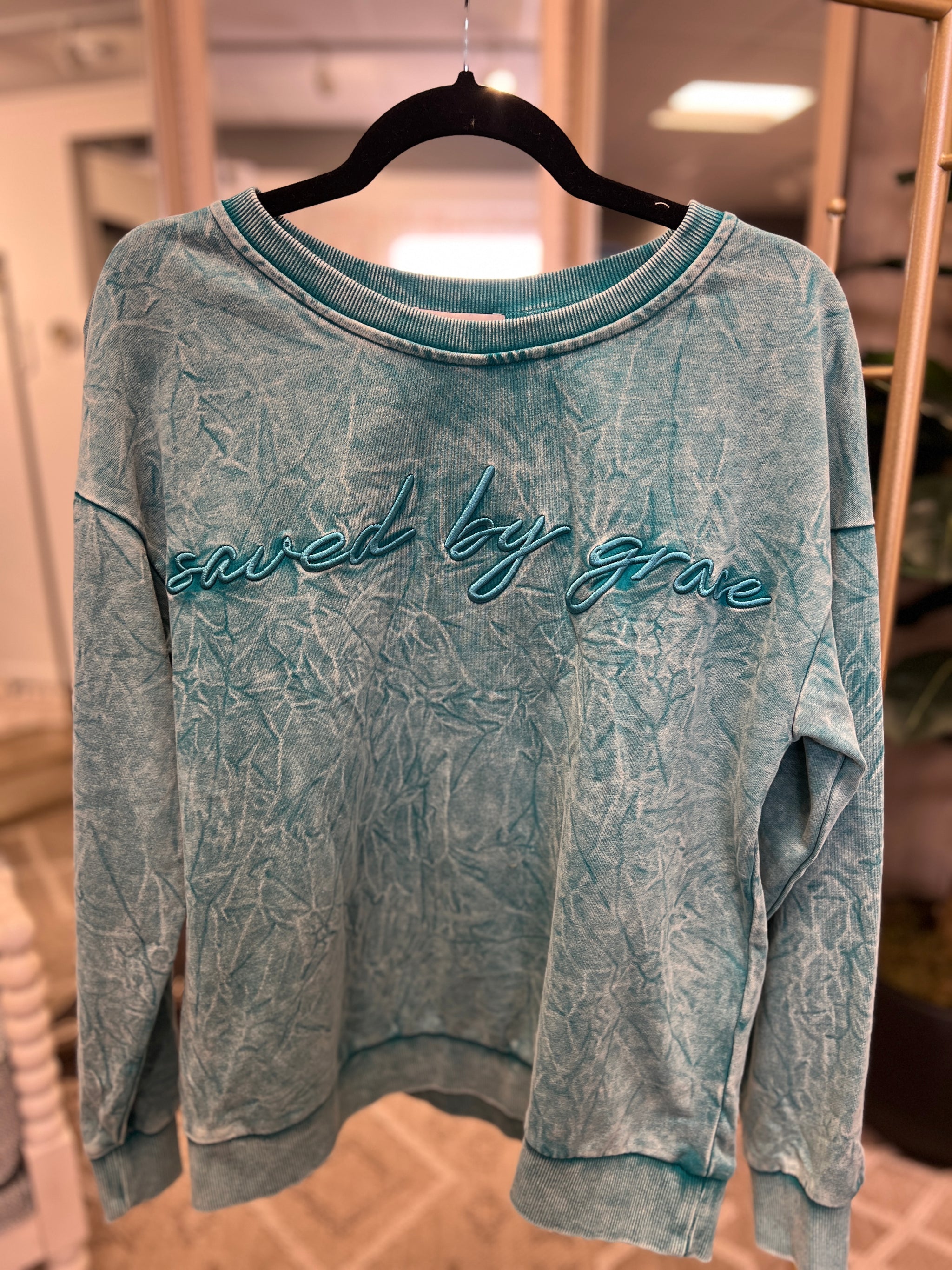 Faith + fashion = the perfect combo ✨ This crewneck is embroidered with “Saved By Grace” across the front — a beautiful daily reminder wrapped in cozy comfort.