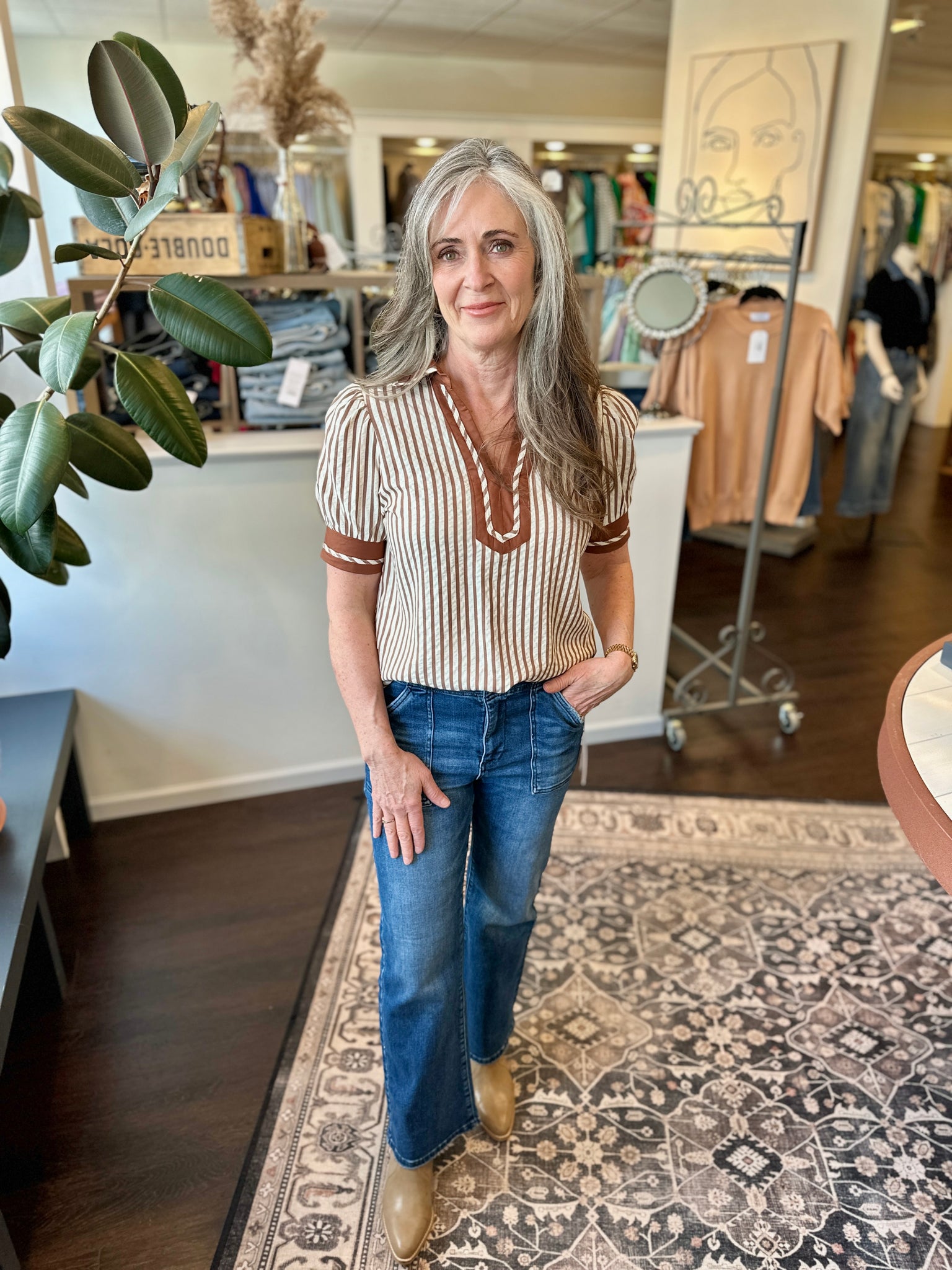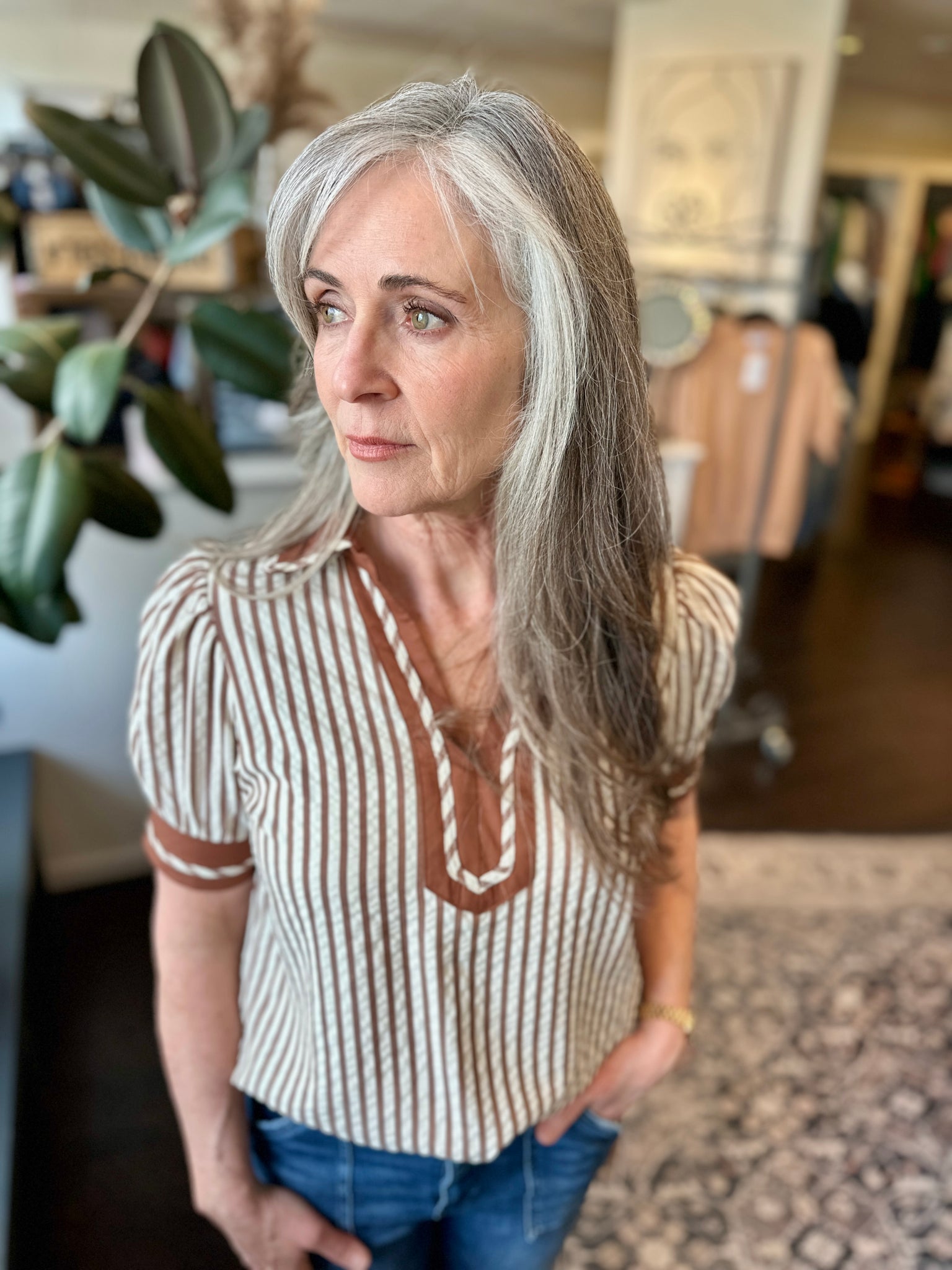 This top features a cream base with vertical brown striping and contrast trim at the neckline and sleeves. Designed with a notched neckline and soft structure through the shoulders, it offers a polished look with lightweight comfort!