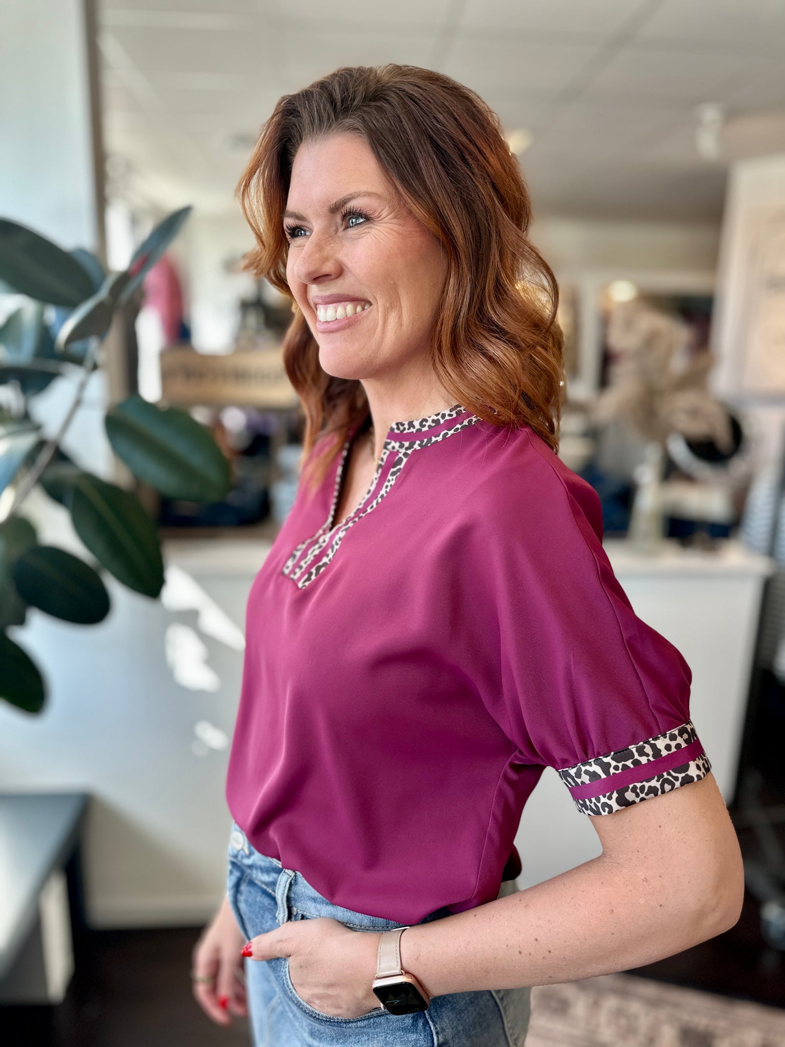 An easy pop of color with just the right boutique detail. The Stacy Top features a rich berry hue with subtle patterned trim at the neckline and sleeves that elevates this otherwise simple silhouette. The relaxed drape makes it comfortable and flattering, while the soft structure allows it to tuck beautifully into denim, skirts, or trousers.