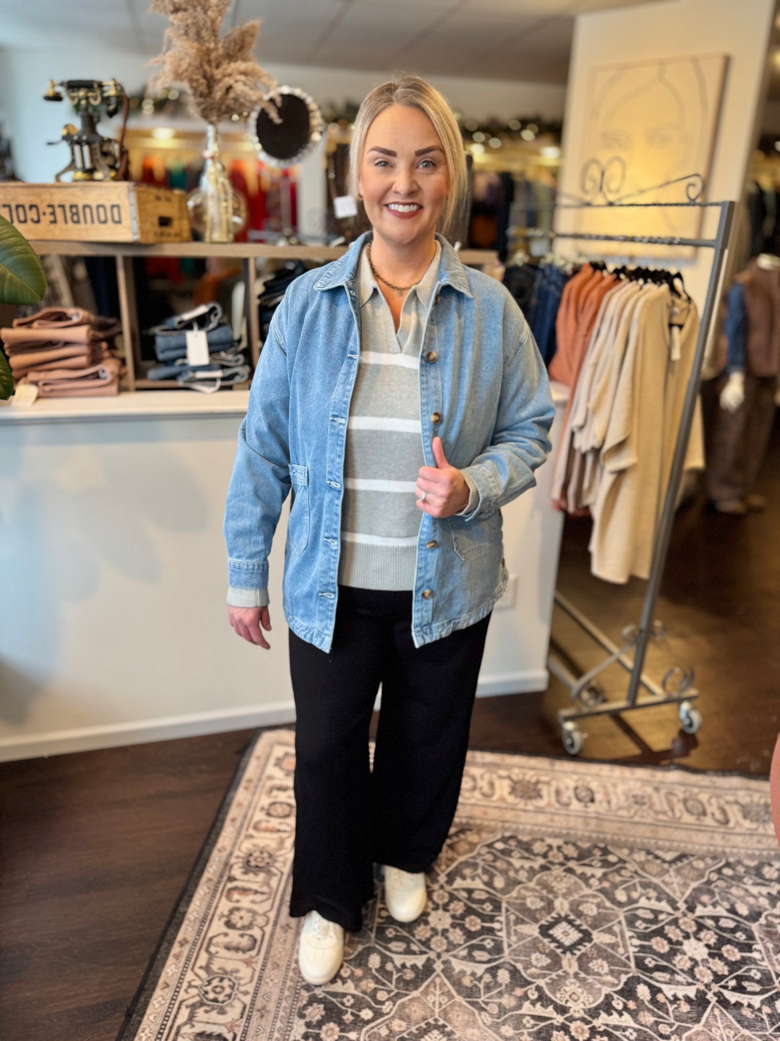 (Sweater seen underneath denim jacket). A soft, easy striped knit with that polo-collar detail we all love—sporty, relaxed, and just structured enough. The wide stripes keep it casual and fresh, and the lightweight feel makes it great for layering under denim, cardigans, or jackets. It’s an elevated-everyday basic with a little personality.