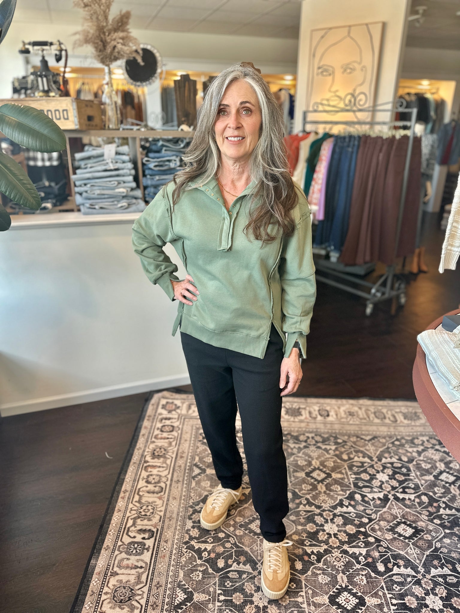 Elevated everyday sweatshirt with thoughtful seam detailing and a buttoned collar that adds just the right amount of polish. This pullover goes beyond basic with its structured feel while still keeping comfort front and center. Easy to dress up with denim or keep casual for everyday wear. Available in sage and tangerine.