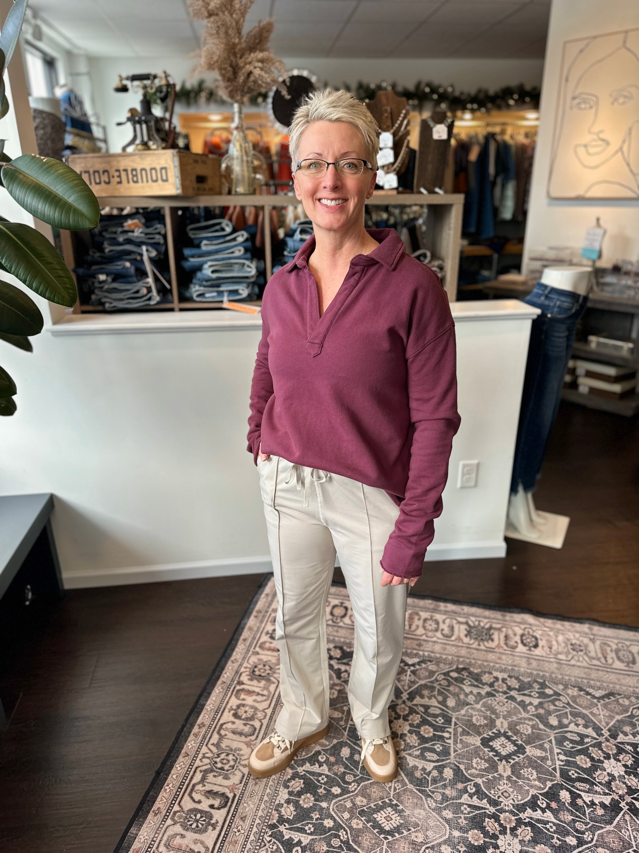 A soft, 100% cotton sweatshirt with elevated details that give it a polished, everyday feel. The ribbed texture through the body and sleeves adds interest without being busy, and the mulberry tone brings a rich, wearable pop of color. Designed with a relaxed-but-flattering fit that pairs easily with joggers, denim, or trousers. Open fit.
